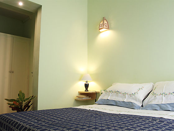 Der moderne Stil und die besonderen Formen geben diesem Raum eine ganz besondere Frische und Lebendigkeit. Die verschiedenen Grünfarben vermitteln einen ganz besondern entspannenden Effekt Dieses Doppelzimmer mit Balkon und Fenster ist sehr hell und einladend.