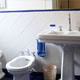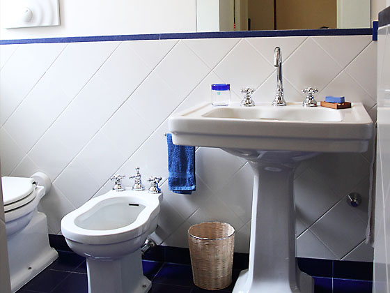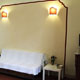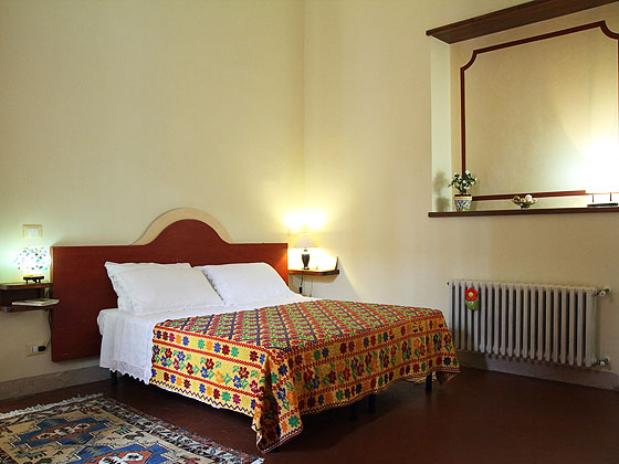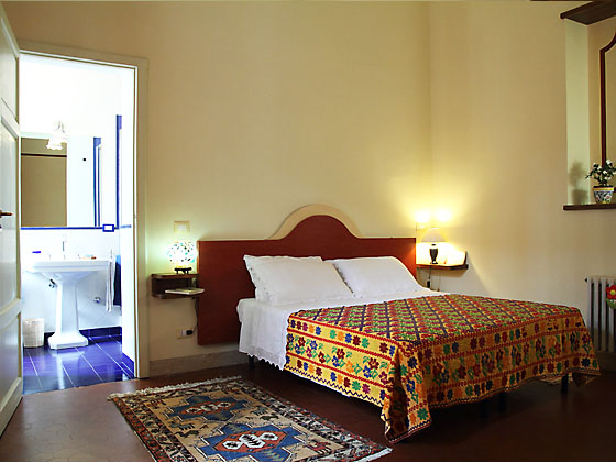 Le tonalità chiare con cornici bordeaux, l’ampia finestra e il comodo divano rendono la camera Rosetta, arredata con mobili d’epoca, classica ed elegante. Nel bagno risalta l’ampia doccia con mosaico di vetro blu e ceramiche dipinte a mano. È una camera doppia che, con i suoi 25 mq, all’occorrenza diventa tripla o quadrupla.